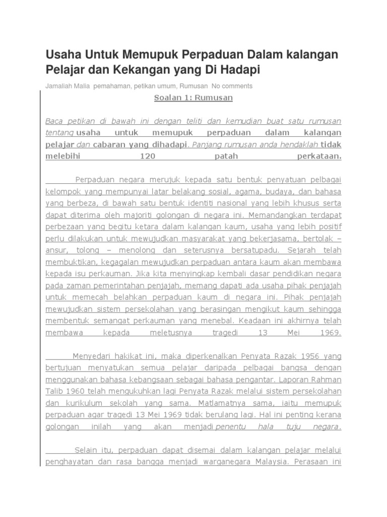 Rumusan Usaha Untuk Memupuk Perpaduan Dalam Kalangan Pelajar Dan Cabaran Yang Dihadapi Bahasa Melayu Spm Kertas 2